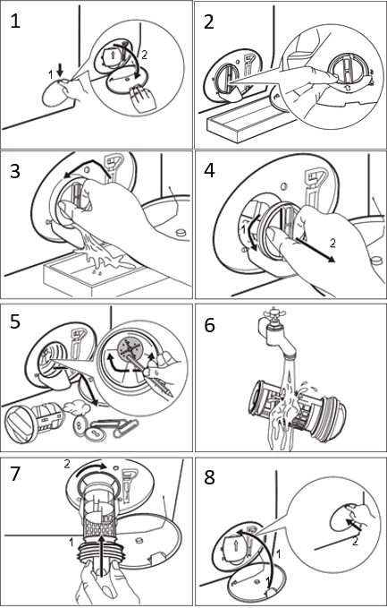 - Очистите насос и фильтр для пуха, включая лопасть насоса (если видна лопасть насоса, поверните её карандашом и установите фильтр на место).