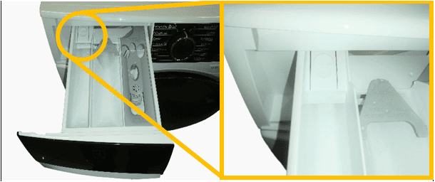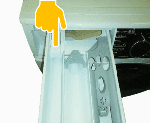 Відкрийте ящик для миючих засобів. Фіксатор (позначений назвою “PUSH”) буде видно зліва.
